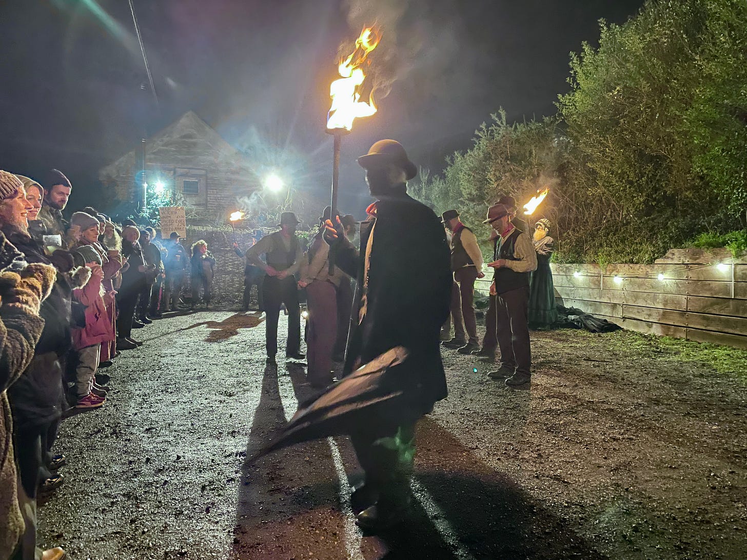 A dull, repeated drum beat; distant fires. Down the dark hill marched a strange procession, lit by lanterns and flaming torches: stony-faced men in antique costume, women shrouded in black with garlands of twigs and ivy on their heads. The crowd, now silent, parted to let them pass. They took up position, the women grouped silently around their instruments: melodions, recorders, drums, a tea-chest bass. The men stood in a rough half-circle facing outwards, hands behind their backs, outstaring the spectators. It was time for the dancing to begin.
