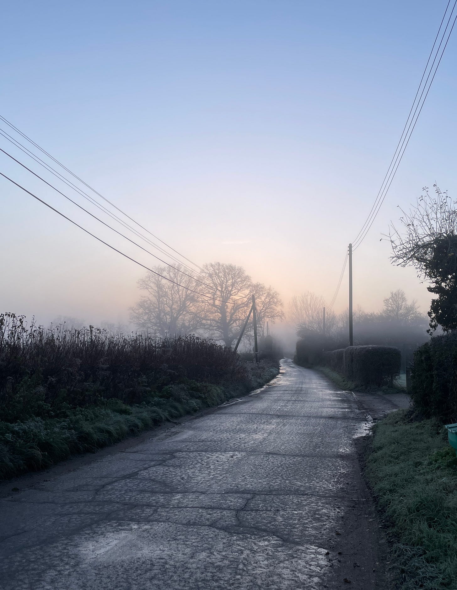 I set out for a run on a day that, despite all the recent wet weather, began in mist and ice. Minus one, and thank the cold, blue heavens for it: closing in on midwinter and only the second proper frost we’ve had. November should be frosty; December should hold us in an iron grip. The bulbs sleeping in the ground need cold in order to wake up; the wildflowers need to be told when to rest. The soil in the fields and gardens needs frost to break up the clods and to kill off pathogens before next year.