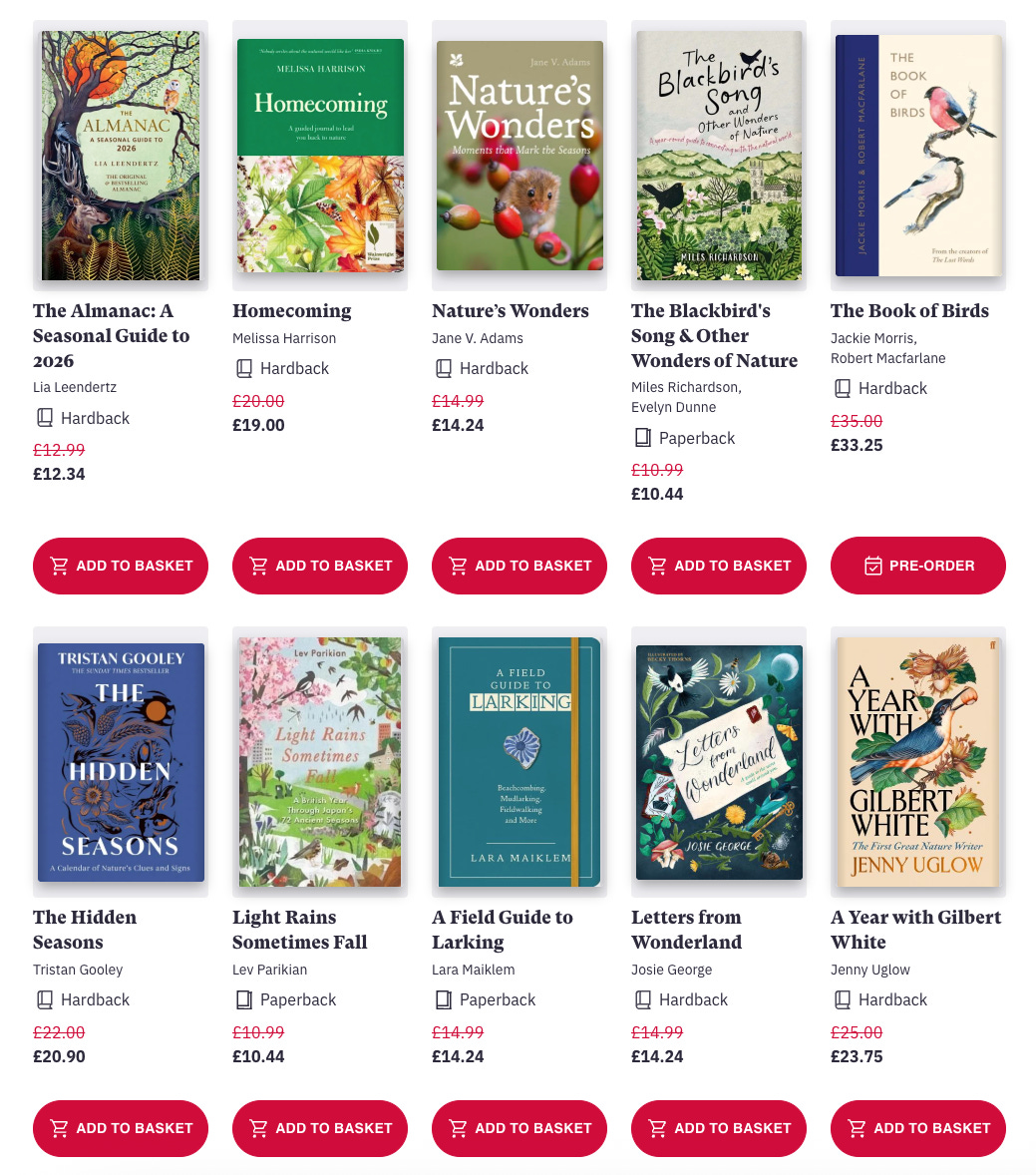 Do you still have any Christmas presents left to buy? Perhaps you’d like something good to read over the festive period? I’ve made a list of 31 lovely books about nature, noticing and the seasons, all of which would make great gifts. You can find them all at Bookshop.org, which supports bricks-and-mortar bookshops with every sale: